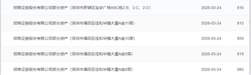 上海联合产权交易所官网挂牌信息显示,招商证券此次拟出售的5处房产均位于深圳市核心区域,合计底价约1.48亿元。其中4处位于福田区的佳和华强大厦A座,涉及第8层至第11层,每层单独挂牌,转让底价均为2984.51万元,合计约1.19亿元。另一处位于罗湖区笋岗东路的宝安广场ABC栋2-B、2-C、2-D,整体转让底价为2813.94万元。挂牌截止日期原为2026年3月17日,现延期至3月24日。
