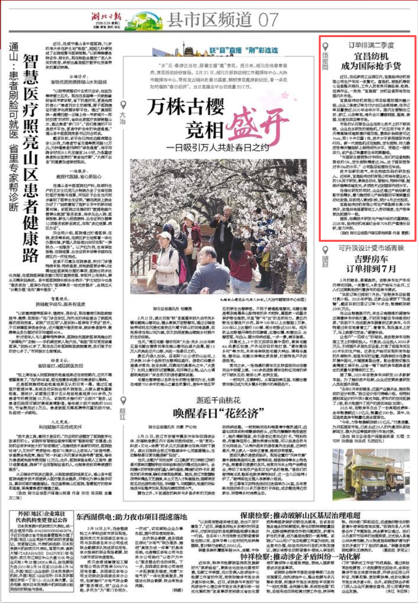 3月24日湖北日报刊发两篇报道聚焦宜昌两家制造企业——湖北新阳特种纤维和宜昌经纬纺机