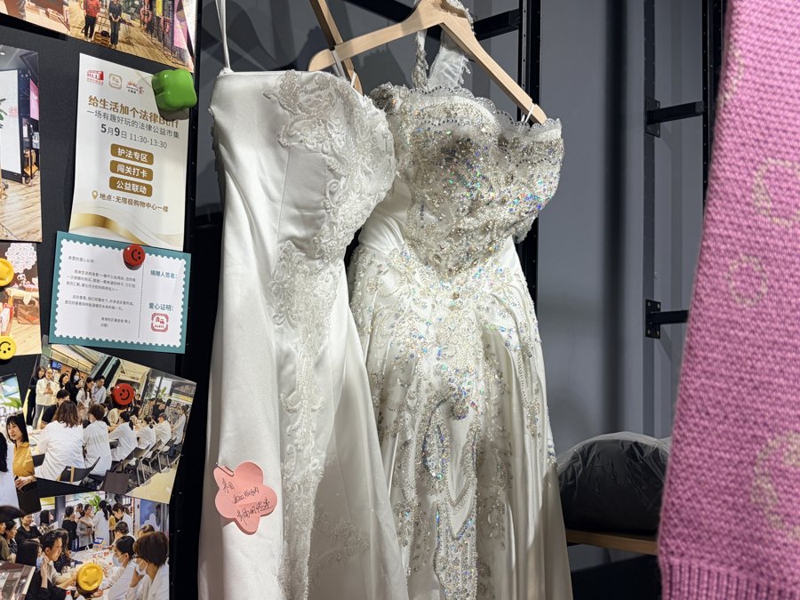 淮海中路街道基金会是上海首个将慈善超市开进核心商圈的街道级基金会。“我们街道工作人口有10万多,而常住人口仅有1.6万,是一个明显的人口倒挂社区。”基金会负责人介绍,这意味着公益服务不能局限于传统社区居民,“街区里的企业、商户、白领,都是我们的服务对象。公益需要主动走出来,整合街区资源,对接多元需求。”基于这样的考量,2025年,基金会多方打探、综合评估,最终将慈善超市落在了新天地商圈的无限极荟购物中心一楼入口处。有了黄金位置,如何让人走进来,又愿意留下来?这对慈善超市的软性营造提出了要求。走进淮爱∞慈善超市,你会发现这里的商品标签有些特别。除了价格,每件物品旁边还附着一张手写卡片,上面记录着捐赠者的信息和物品背后的故事。比如两件来自云南西双版纳的婚纱,标签上写着捐赠者的寄语:“幸福传递”。店员介绍,这是去年一位新婚旅行途经上海的新娘捐赠的主婚纱与副婚纱,“她捐赠后还主动询问,能不能为公益多尽一份力”。考虑到这件婚纱承载的特殊意义,门店决定暂不标价,“它是无价的,我们等待一位有缘人,让这份幸福延续”。