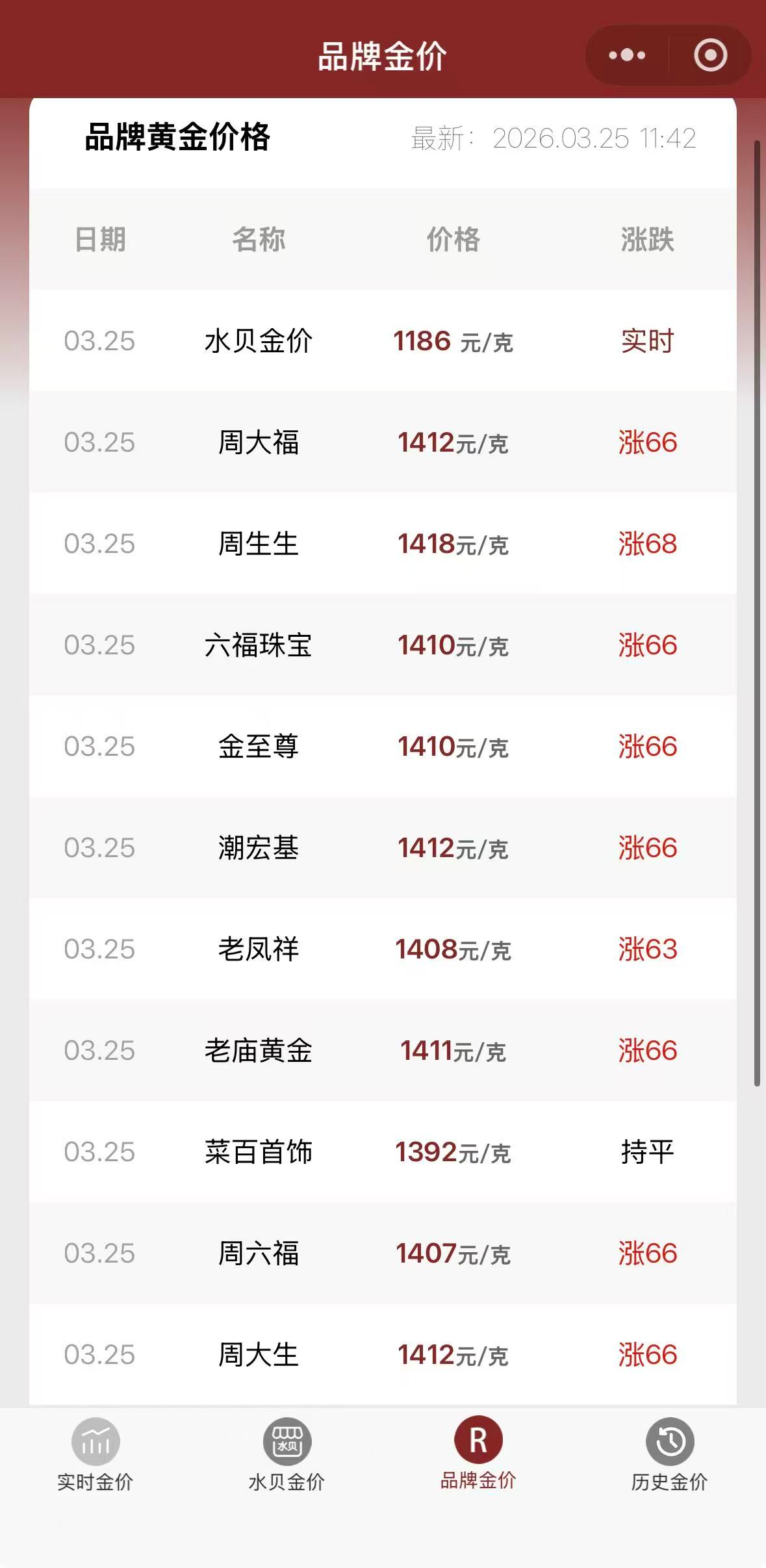 国际黄金上涨的同时,国内品牌金饰价格止跌反弹。3月25日,周生生(00116.HK)金饰克价较昨日上涨68元至1418元/克,周大福(01929.HK)、六福珠宝、潮宏基(002345.SZ)、老庙黄金等多个品牌金饰价格均较昨日上涨66元/克。