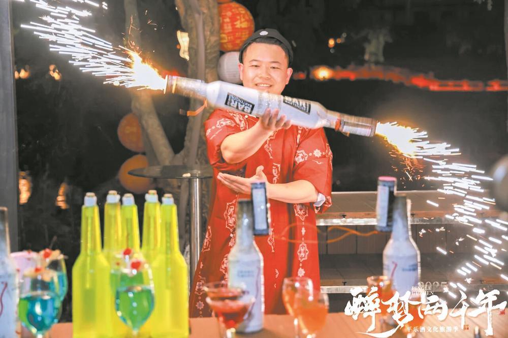 调酒师以邛酒调天下酒,炫酷调酒,献技八方游客。图据醉美邛崃公众号