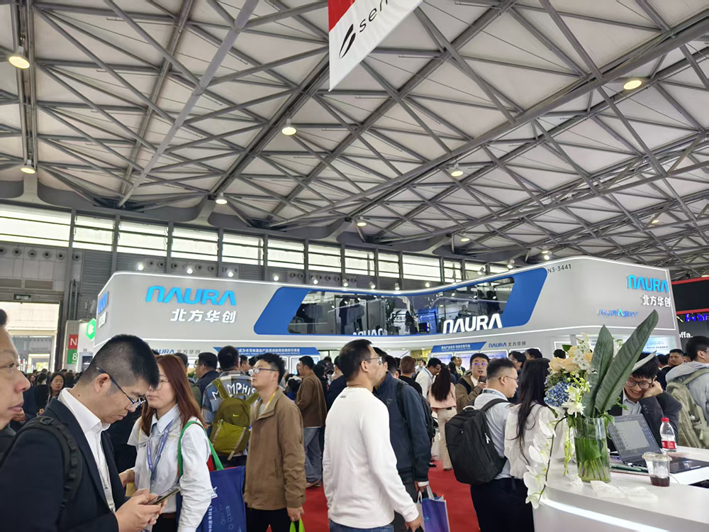 北方华创现场大屏幕播放的视频吸引了不少参展人士围观,展区中央坐满了人。公司主要产品都通过视频图片展示和介绍。
