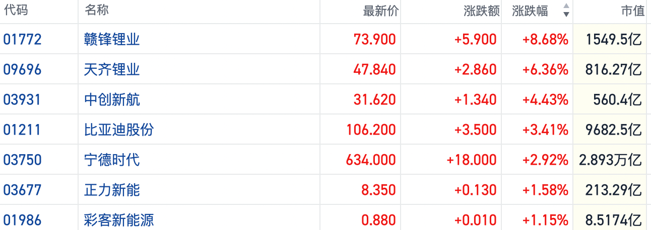 截至发稿,赣锋锂业(01772.HK)涨超8%,刷新年内高点。天齐锂业(09696.HK)涨超6%,宁德时代(03750.HK)等多只个股跟涨超3%。