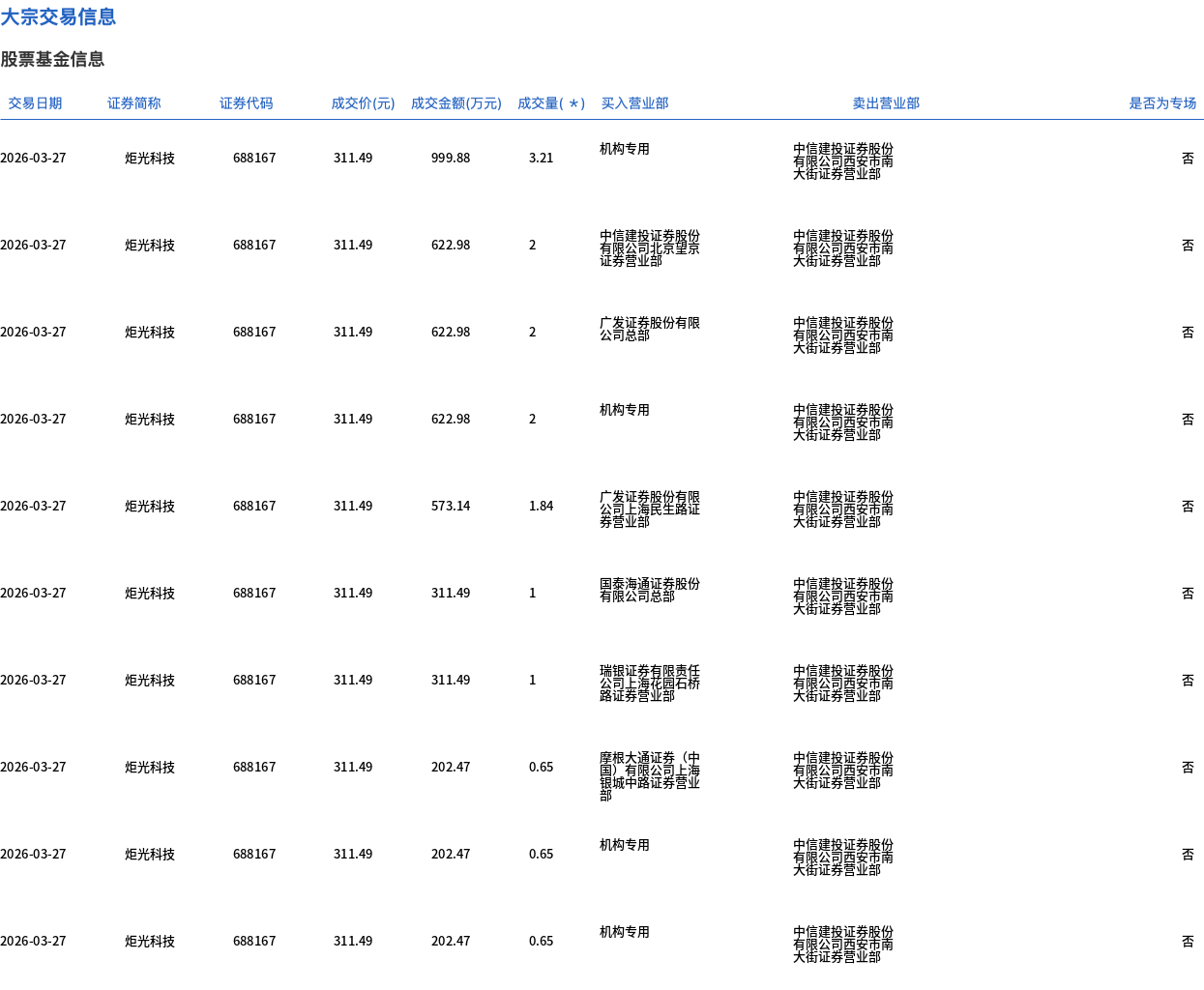 大宗交易成交15万股,成交额4672.35万元,占当日总成交额的2.3%,成交价311.49元,较市场收盘价346.68元折价10.15%。