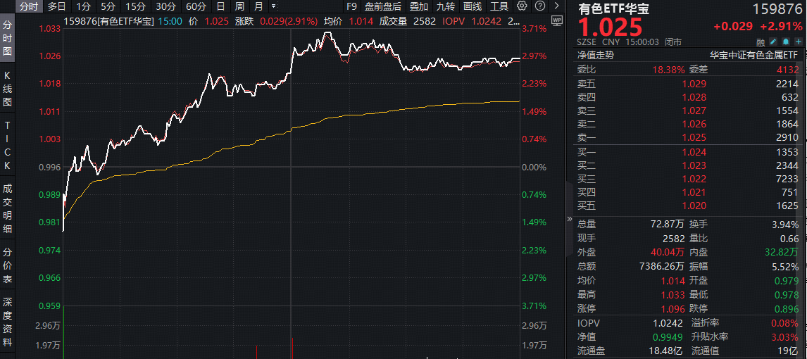 热门ETF方面,揽尽有色金属行业龙头的有色ETF华宝(159876)场内涨幅最高上探3.61%,收涨2.91%,收复10日均线。