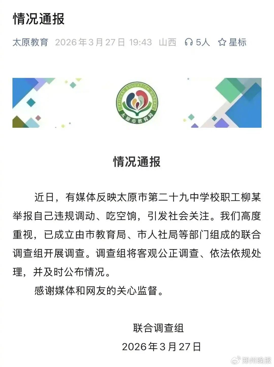 3月27日,太原教育局通报“男子举报自己吃空饷”:已成立由市教育局、市人社局等部门组成的联合调查组开展调查。