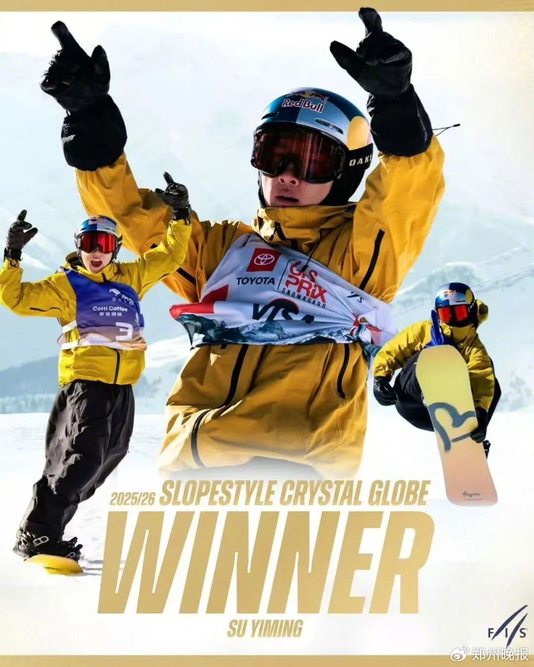 据国际雪联官网消息,中国选手苏翊鸣斩获2025—2026赛季国际雪联单板滑雪男子坡面障碍技巧世界杯赛季总冠军。