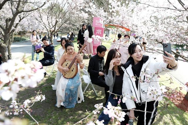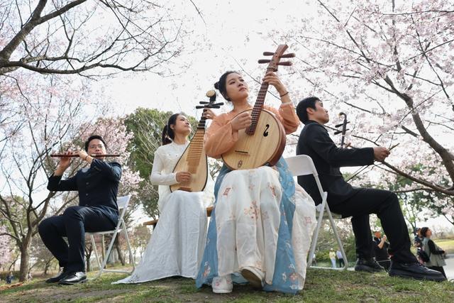 在申城赏樱地标顾村公园的樱花林下,宝山专场系列活动正式启幕,悠扬的江南丝竹乐声吸引市民驻足观赏,构成一幅与美共生的春日图景,赖鑫琳 摄