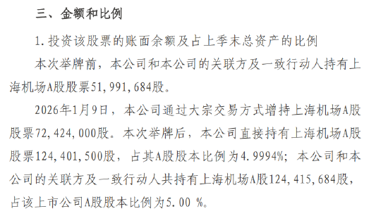 根据披露,根据2026年1月9日上海机场A股收盘价,太保寿险持有上海机场股票的账面余额约为人民币40.67亿元,占该公司2025年三季度末总资产的比例为0.15%,符合监管要求。