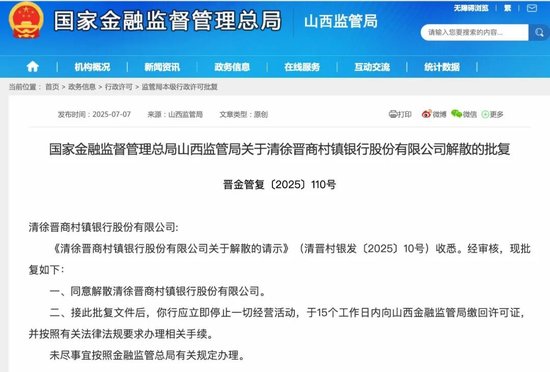 2025年夏季,山西银行业迎来一轮剧烈洗牌。8月中旬,国家金融监督管理总局集中批复,同意山西介休农村商业银行大靳支行、山西尧都农村商业银行龙兴支行等多家支行正式终止营业。监管部门要求这些支行立即停止一切经营活动,并在15个工作日内缴回许可证。