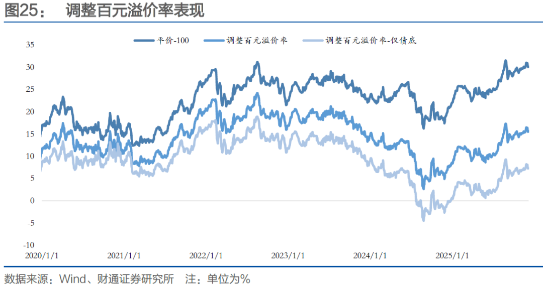 调整百元溢价率下行。剔除债性、剩余期限等因素影响的调整百元溢价率水平15.66%,处于近半年以来的85.2%历史分位,2018年以来72%历史分位,仅考虑债底的调整百元溢价率处于近半年以来82.6%历史分位,2018年以来40.7%历史分位。