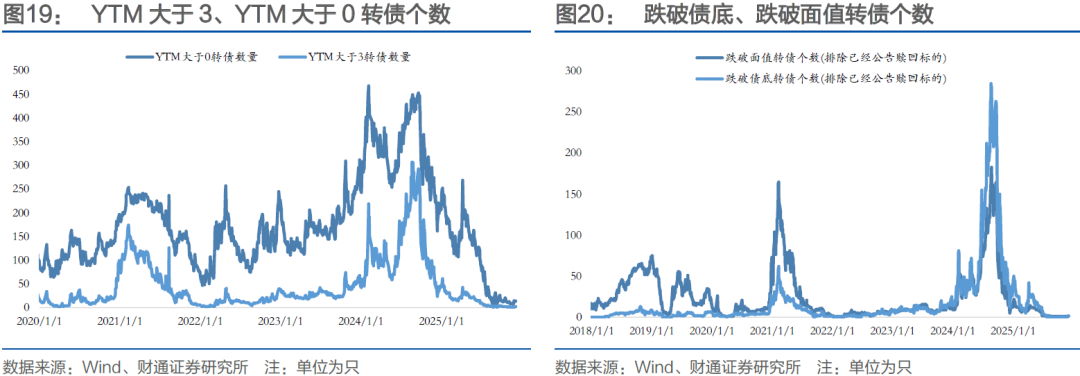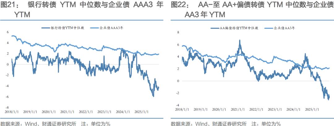 YTM方面,银行转债YTM中位数-4.26%,低于3年企业债AAA到期收益率6.18pct;AA-至AA+偏债转债YTM中位数-2.76%,低于3年企业债AA到期收益率4.89pct。
