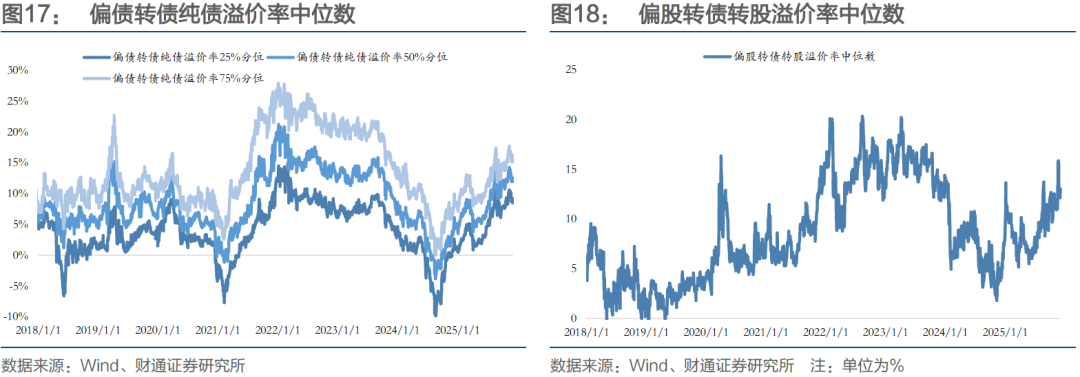 偏股转债方面,偏股转债转股溢价率中位数收于13.05%,较前周最后一个交易日上涨0.63pct,处于近半年以来93.2%历史分位。偏债转债方面,偏债转债纯债溢价率中位数收12.58%,较前周上涨0.25pct,处于近半年以来82.3%历史分位。
