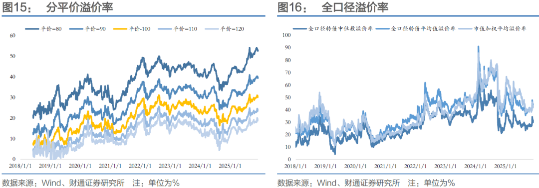 本周转债市场百元溢价率下跌。截至本周最后一个交易日,转债市场百元溢价率收于30.16%,较前周下跌0.79%,处于近半年以来87.3%历史分位,近一年以来94%历史分位。同期全口径转债转股溢价率中位数上涨1.66pct至31.5%,市值加权转股溢价率(剔除银行)上涨1.03pct至43.44%。