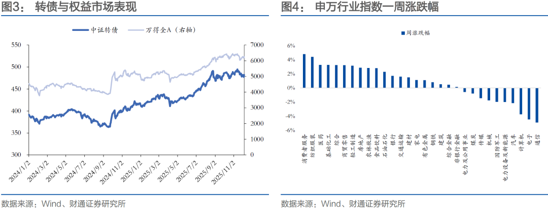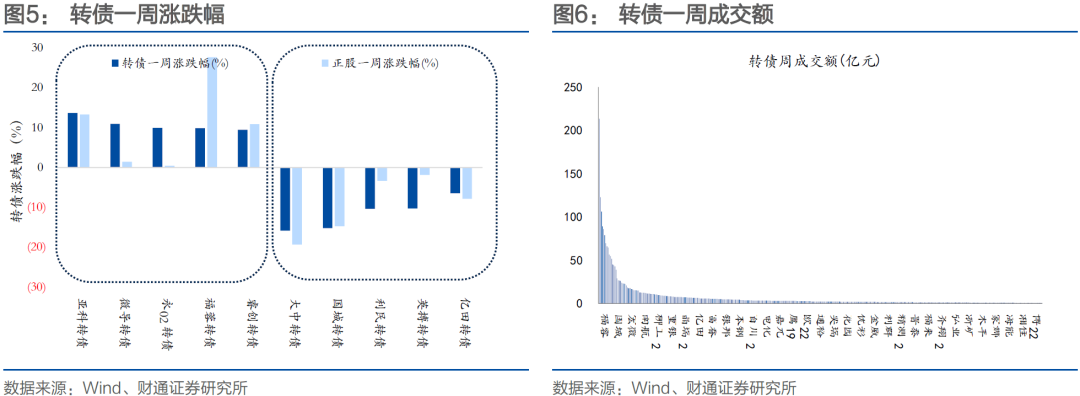 本周无转债上市。两市合计206只转债上涨,占比52%,涨跌幅居前五的为亚科转债(13.65%)、微导转债(10.95%)、永02转债(9.89%)、福蓉转债(9.80%)、睿创转债(9.45%),涨跌幅居后五的为大中转债(-15.80%)、国城转债(-15.19%)、利民转债(-10.39%)、英搏转债(-10.29%)、亿田转债(-6.43%);从相对估值的角度来看,226只转债转股溢价率抬升,占比57%,估值变动居前五的为芳源转债(20.92%)、欧晶转债(17.17%)、龙大转债(16.72%)、火星转债(14.32%)、锂科转债(13.55%),估值变动居后五的为瑞科转债(-23.81%)、宏微转债(-19.54%)、恒逸转2(-19.46%)、卓镁转债(-18.84%)、福蓉转债(-16.58%)。