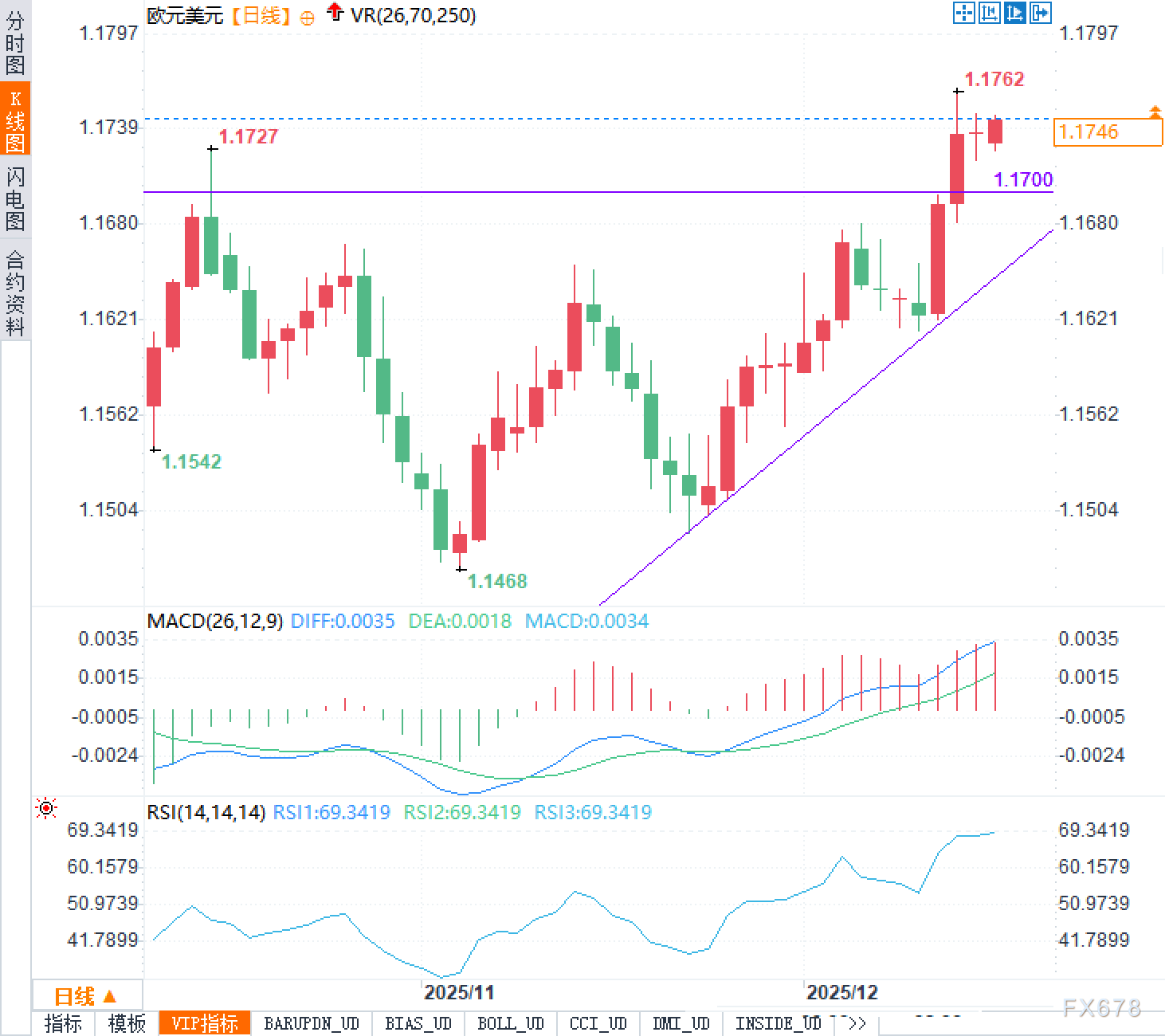 欧元兑美元在过去三周累计上涨近2%,周一的价格走势则呈现出高位盘整的特征,整体维持在上周五的交易区间之内。从技术面观察,汇价在1.1700一线获得有效支撑,而1.1762的多月高点则构成近期的关键阻力位。日线图上的MACD指标显示多头动能仍在延续,DIFF值与DEA值均处于零轴上方,且柱状图持续为正,表明短期趋势依然偏多。RSI指标读数接近69,虽然尚未进入超买区域,但已经显示出一定程度的高位特征,这意味着汇价在进一步上行之前可能需要经历技术性的整理过程。