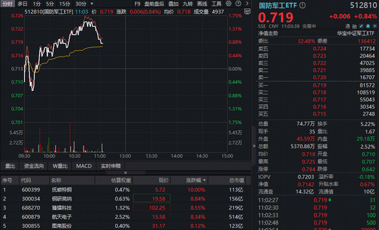 高人气国防军工ETF(512810)逆市摸高1.54%,价格创近2个月新高! 上周,国防军工ETF(512810)大幅跑赢沪指及沪深300,周线三连阳。