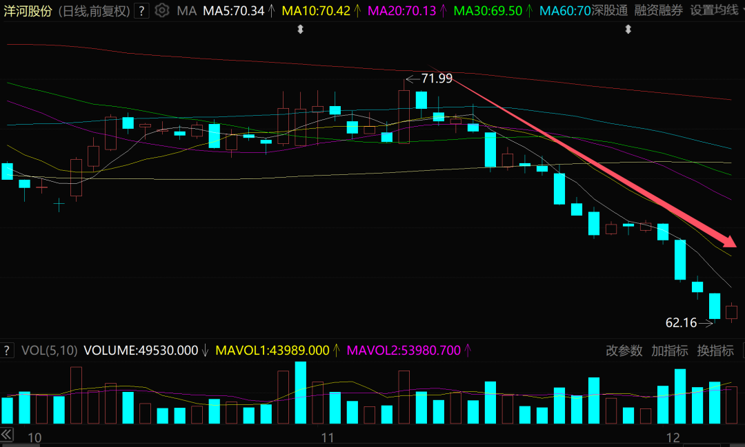 白酒大票里这波跌幅最惨的当属洋河股份,最近十几个交易日从72元附近跌到62元附近,跌幅高达13%。