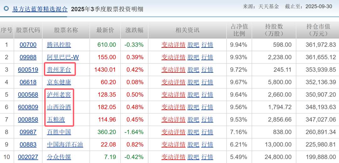 2024年末,易方达蓝筹精选持有洋河股份3600万股,持股市值30.07亿元,占基金净值比例8.02%,位列前十大重仓股。从2025年一季度开始,张坤大幅减持洋河股份,持股数量降至2550万股,持股市值19.44亿元,占基金净值比例降至5%。到二季度完全清仓,结束了多年的连续重仓持有。