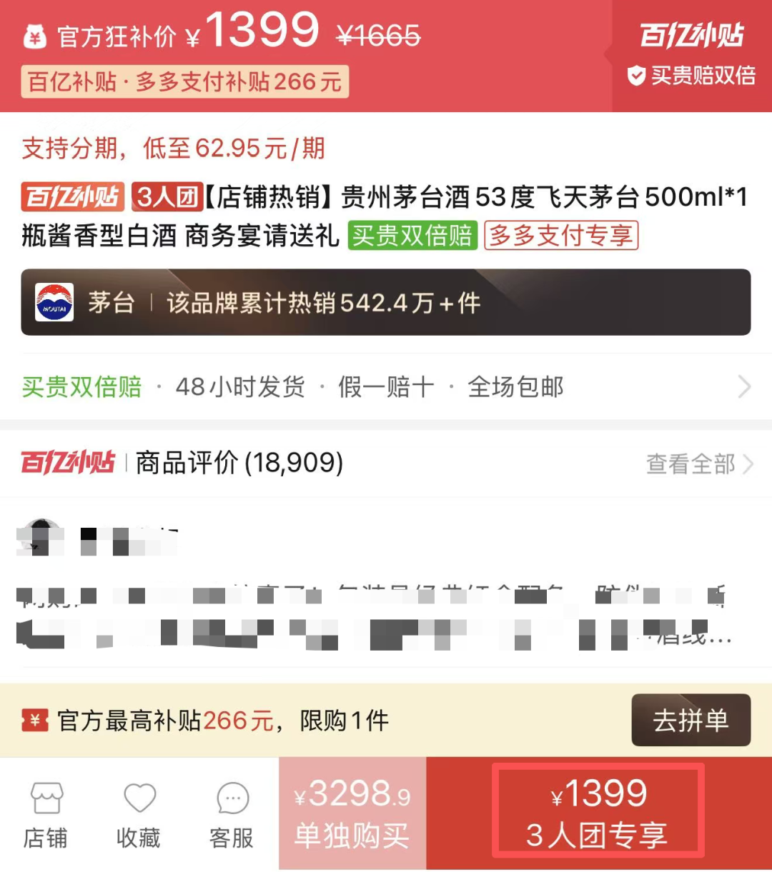 目前,某多多的53度飞天茅台3人团价格为1399元,比官方指导价整整下跌100元。比年初2220元的高点狂降800多元,跌幅接近40%。