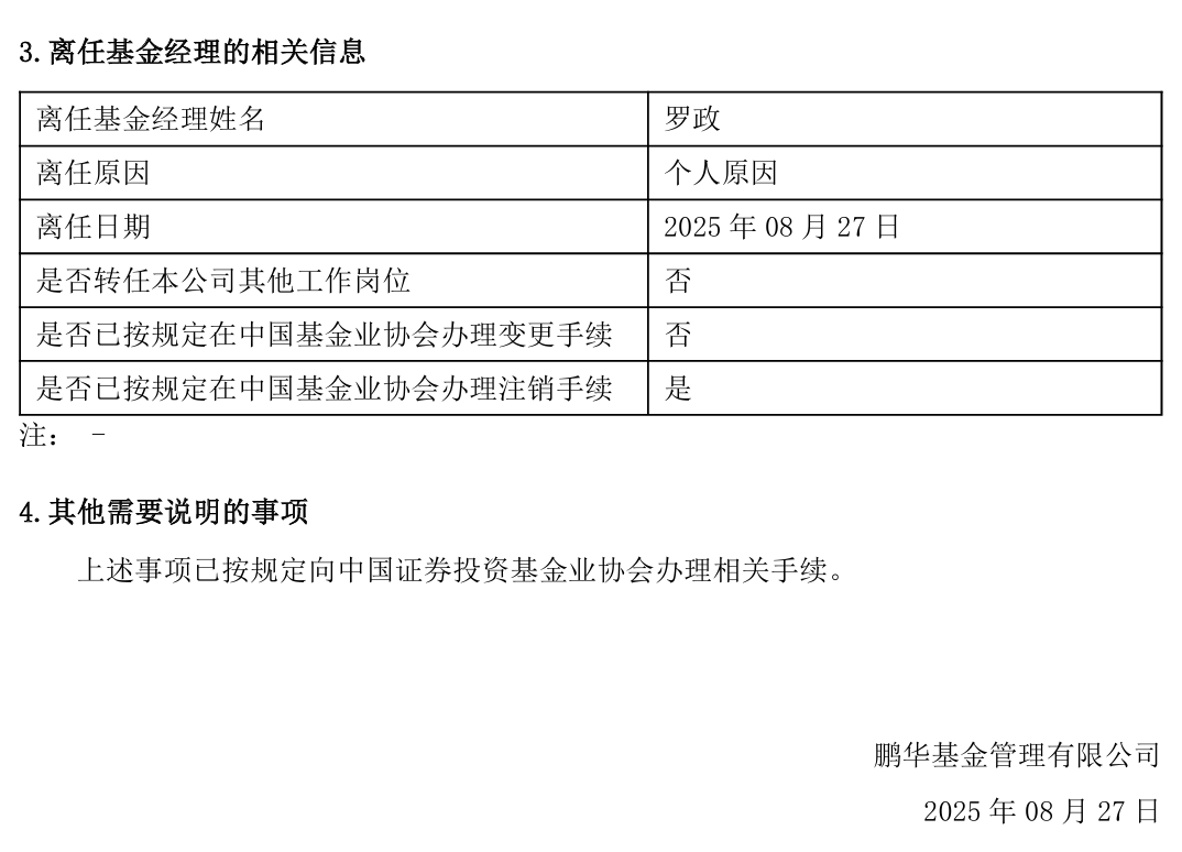 因个人原因,罗政于2025年8月27日离任鹏华弘泽混合(001172)、鹏华丰和债券(160621)、鹏华上华一年持有期混合(013353)、鹏华宁华一年持有期混合(011414)的基金经理。