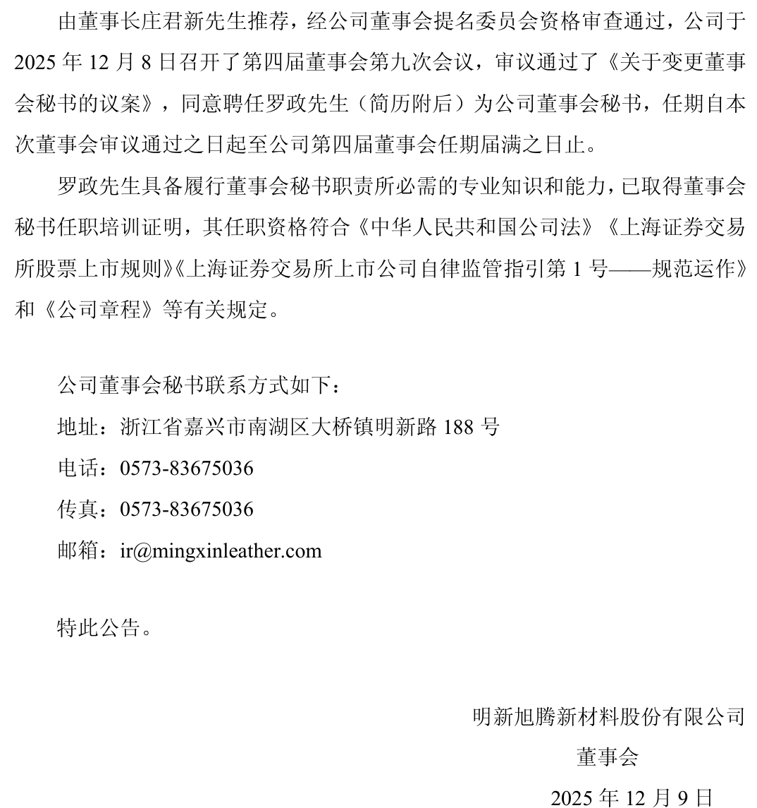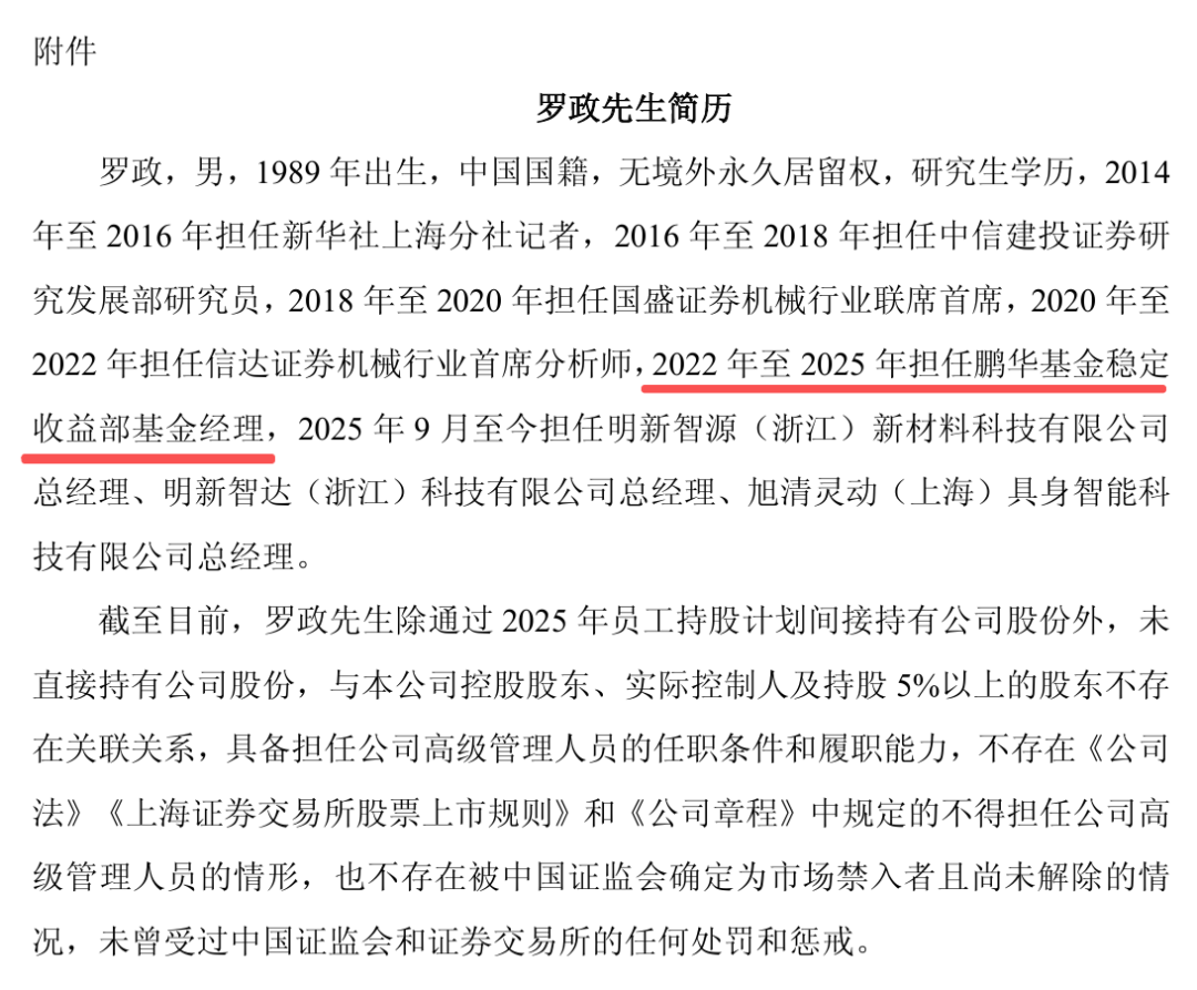 罗政2025年9月至今担任明新旭腾旗下明新智源(浙江)新材料科技有限公司总经理、明新智达(浙江)科技有限公司总经理、旭清灵动(上海)具身智能科技有限公司总经理。此番再获董秘新身份。