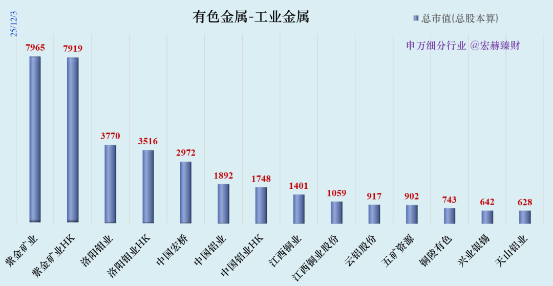 紫金矿业7965亿、洛阳钼业3770亿、中国宏桥2972亿。