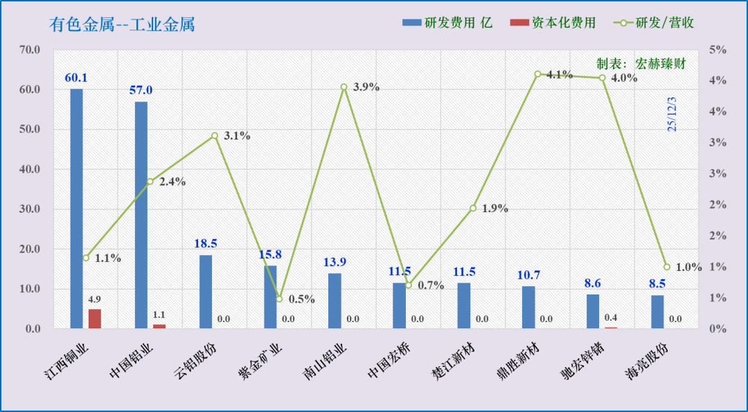 研发投入三甲:江西铜业60亿、中国铝业57亿、云铝股份19亿。