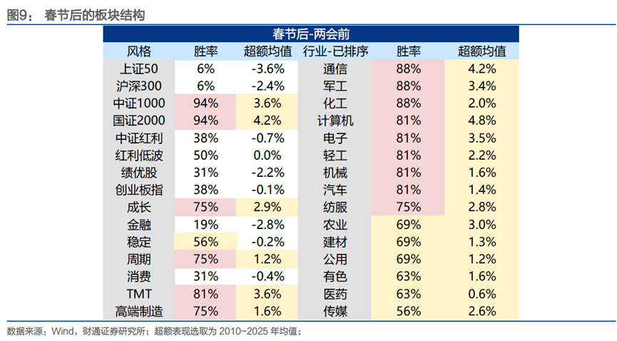 更细致的规律是,市场往往在节前数个交易日结束调整、开启反弹,这份趋势时常还会延续至节后,甚至春节后到两会前,小盘与成长风格的超额概率会更高。