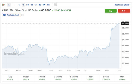 周三(12月17日)亚市交易时段,国际银价再度飙升至创纪录高位,因美国经济不确定性加剧刺激避险需求升温。