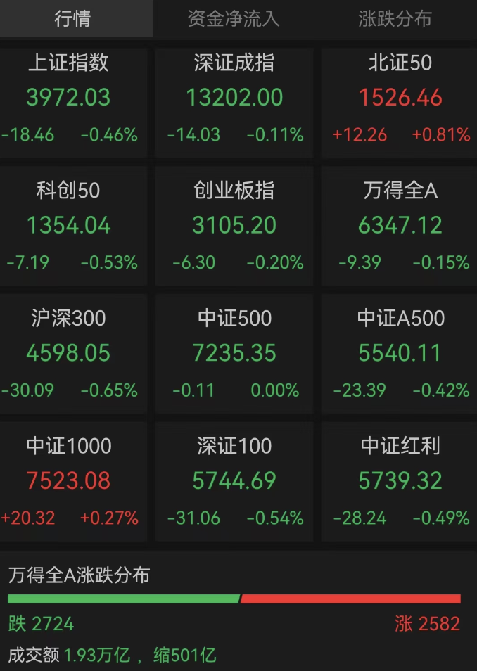 市场全天成交1.93万亿元,上日成交1.98万亿元;共2584只个股上涨,100只个股涨停,2726只个股下跌。