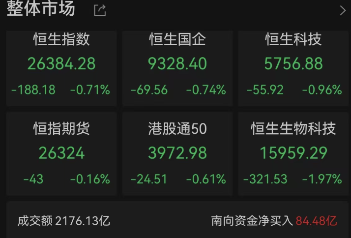 港股方面,同样是震荡走低,恒生指数收跌0.71%,报26384.28点;恒生科技指数下跌0.96%,报5756.88点。市场成交额2176.13亿港元,南向资金净买入84.48亿港元。