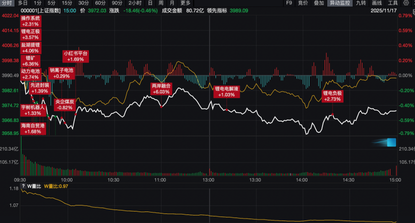 11月17日,A股市场走势较弱,沪指低开低走,截至收盘跌0.46%报3972.03点,深成指跌0.11%,创业板指跌0.2%。