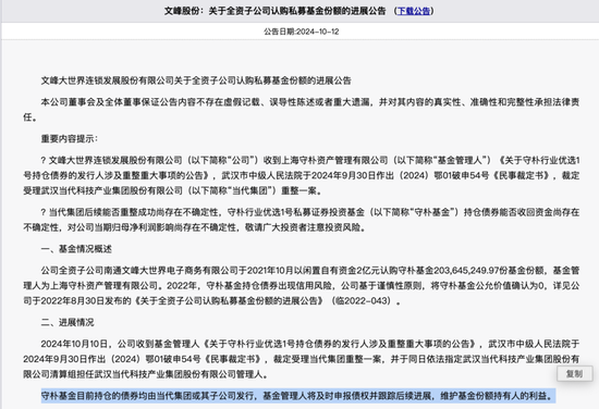 最早让守朴资产走进公众视野的,是2021年的“当代系”债券踩雷事件。当年10月,文峰股份全资子公司拿出2亿元自有资金,认购了翟建业亲自操盘的守朴行业优选1号私募产品。彼时该产品单位净值0.9821元,产品说明书明确标注“主打债券等固定收益资产,谨慎投资、力争稳健收益”,看上去是低风险配置的不错选择。
