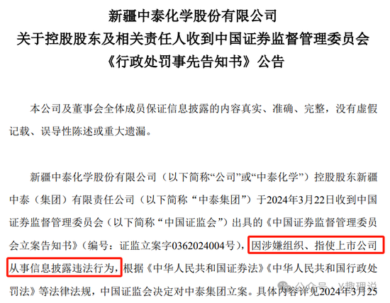 最近,由于控股股东中泰集团涉嫌组织、指使上市公司从事信息披露违法行为,中国证监会已对其展开调查。同时,中泰化学收到了新疆证监局关于对公司采取责令改正措施的决定。