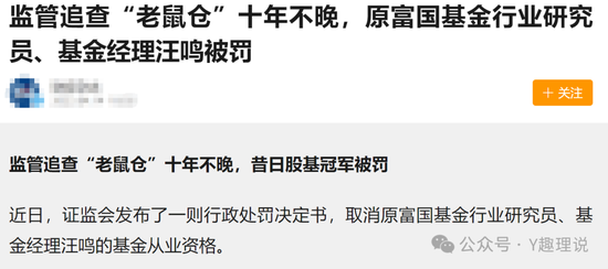 去年,证监会作出了一项行政处罚,取消了原富国基金汪鸣的基金从业资格。汪鸣曾是富国基金的行业研究员兼基金经理,还在2015年的牛市中以104%的年度收益率获得股票型基金冠军。