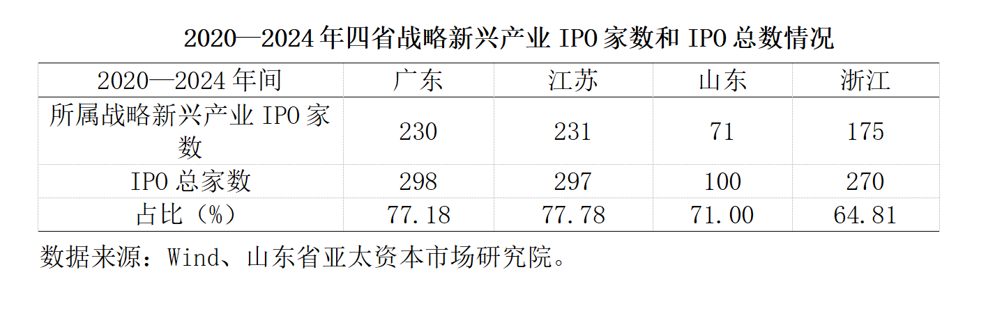 最后,传统产业是孕育新质生产力的肥沃土壤。习近平总书记指出:“传统产业改造升级,也能发展新质生产力”,“发展新质生产力不是忽视、放弃传统产业“,要在“育新枝栽新苗”的同时,也让“老树发新芽”。山东虽是传统产业大省,这些产业在数字化、智能化、绿色化技术加持下,同样焕发出新质生产力活力。以机械设备、基础化工行业为例,2020年至2024年,两大行业IPO数量为33家,其中属于战略新兴产业的数量达27家,占比高达81.82%。可以看出,传统产业经过转型升级,照样哺育新质生产力发展。