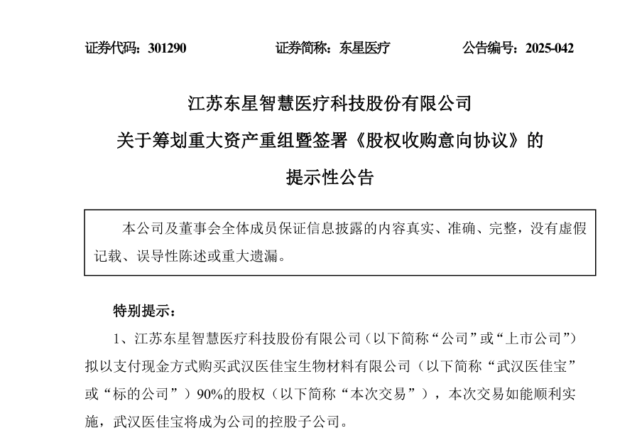 9 月26日晚间,东星医疗发布《关于筹划重大资产重组的提示性公告》,正式披露拟以支付现金方式收购武汉医佳宝 90% 股权的交易计划。