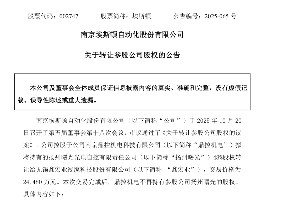第一则公告称,埃斯顿控股子公司南京鼎控机电科技有限公司(以下简称“鼎控机电”)拟将持有的扬州曙光光电自控有限责任公司(以下简称“扬州曙光”)股权转让给无锡鑫宏业线缆科技股份有限公司(以下简称 “鑫宏业”)。
