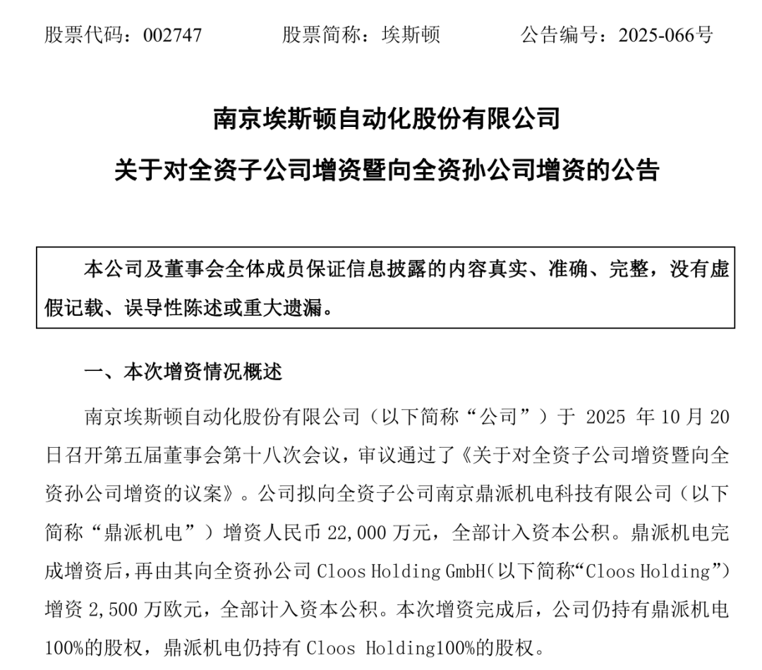 另一则公告披露了埃斯顿拟向全资子公司南京鼎派机电科技有限公司(以下简称“鼎派机电”)增资人民币2.2亿元,全部计入资本公积。鼎派机电完成增资后,再由其向全资孙公司CloosHoldingGmbH(以下简称“CloosHolding”)增资2,500万欧元(折合人民币约 2.07 亿元),全部计入资本公积。