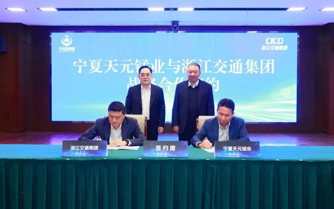 10月23日,在浙江省交通投资集团总部,天元锰业集团与该集团签订战略合作协议。天元锰业董事局主席贾天将,浙江省交通投资集团党委书记、董事长高浩孟共同出席仪式并见证签约。天元锰业董事局董事、副总裁焦双,副总裁吕正光、金诗尧,浙江省交通投资集团副总经理袁仁军等共同参加签约仪式,标志着两大龙头企业在全球锰产业布局与交通资源整合领域深度合作正式启动。