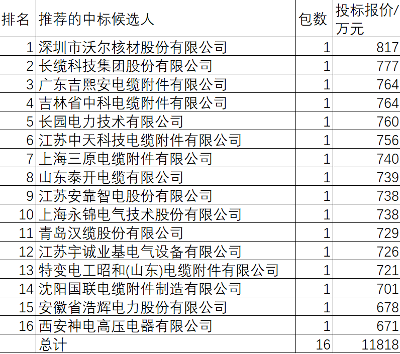 国网2025-5电缆附件共招16包11818万元,由16家供应商中标提供,每家企业各中1包。