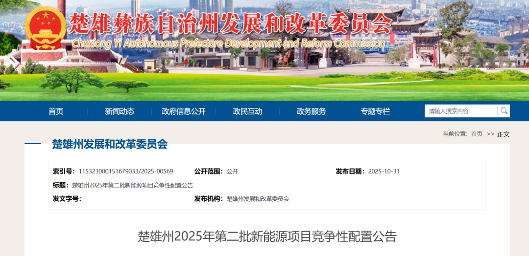 为充分发挥楚雄州新能源资源优势,持续打造云南绿色能源强省建设,进一步规范楚雄州新能源资源开发行为,推动新能源(光伏发电+风电)项目的有序开发、加快投产,根据《中华人民共和国能源法》《云南省人民政府印发关于加快光伏发电发展若干政策措施的通知》(云政发〔2022〕16号)、《云南省发展和改革委员会关于印发规范风电项目核准管理有关事项的通知》(云发改能源规〔2023〕2号)、《云南省发展和改革委员会 云南省能源局关于进一步规范开发行为加快光伏发电发展的通知》(云发改能源〔2023〕264号)、《云南省发展和改革委员会关于加强光伏资源开发建设有关工作的通知》(云发改能源〔2023〕785号)和《云南省发展和改革委员会 云南省能源局关于印发云南省2025年第二批新能源项目开发建设方案的通知》(云能源新能〔2025〕193号)等文件的相关要求,为切实做好2025年度第二批新能源项目业主确定及开发工作,现将竞争性配置具体事项公告如下: