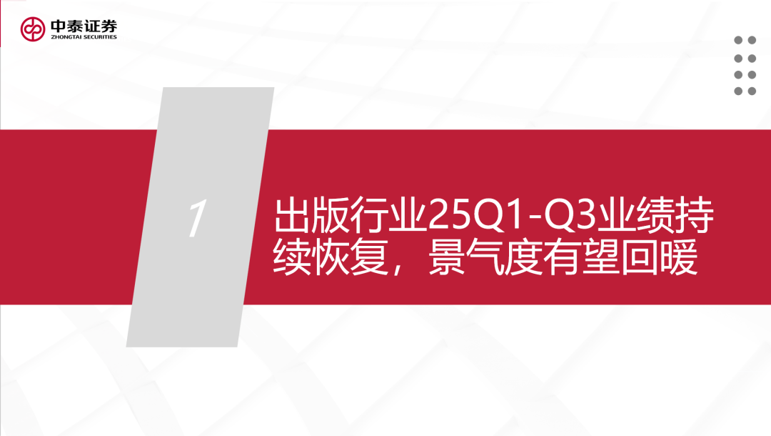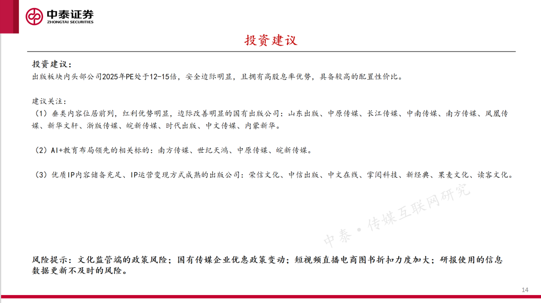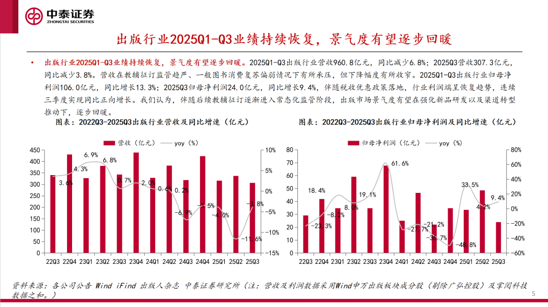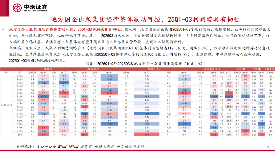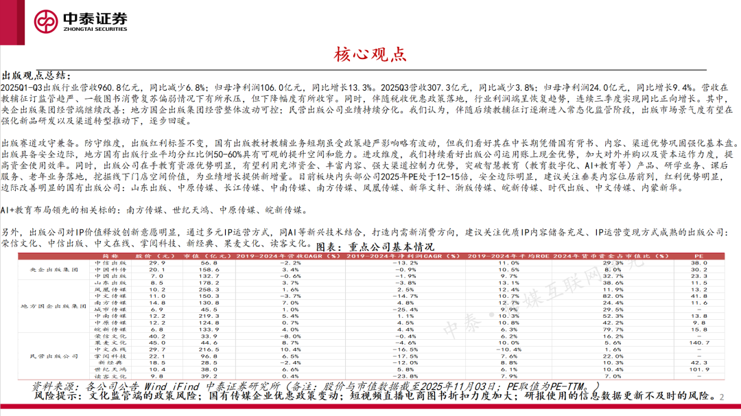 出版观点总结: 2025Q1-Q3出版行业营收960.8亿元,同比减少6.8%;归母净利润106.0亿元,同比增长13.3%。2025Q3营收307.3亿元,同比减少3.8%;归母净利润24.0亿元,同比增长9.4%。营收在教辅征订监管趋严、一般图书消费复苏偏弱情况下有所承压,但下降幅度有所收窄。同时,伴随税收优惠政策落地,行业利润端呈恢复趋势,连续三季度实现同比正向增长。其中,央企出版集团经营端继续改善;地方国企出版集团经营整体波动可控;民营出版公司业绩持续分化。我们认为,伴随后续教辅征订逐渐进入常态化监管阶段,出版市场景气度有望在强化新品研发以及渠道转型推动下,逐步回暖。 出版赛道攻守兼备。防守维度,出版红利标签不变,国有出版教材教辅业务短期虽受政策趋严影响略有波动,但我们看好其在中长期凭借国有背书、内容、渠道优势巩固强化基本盘。出版具备安全边际,地方国有出版行业平均分红比例50-60%具有可观的提升空间和能力。进攻维度,我们持续看好出版公司运用账上现金优势,加大对外并购以及资本运作力度,提高资金使用效率。同时,出版公司在手教育资源优势明显,有望利用充沛资金、丰富内容、强大渠道控制力优势,突破智慧教育(教育数字化、AI+教育等)产品、研学业务、课后服务、老年业务落地,挖掘线下门店空间价值,为业绩增长提供新增量。目前板块内头部公司2025年PE处于12-15倍,安全边际明显,建议关注垂类内容位居前列,红利优势明显,边际改善明显的国有出版公司:山东出版、中原传媒、长江传媒、中南传媒、南方传媒、凤凰传媒、新华文轩、浙版传媒、皖新传媒、时代出版、中文传媒、内蒙新华。 AI+教育布局领先的相关标的:南方传媒、世纪天鸿、中原传媒、皖新传媒。