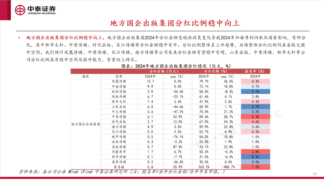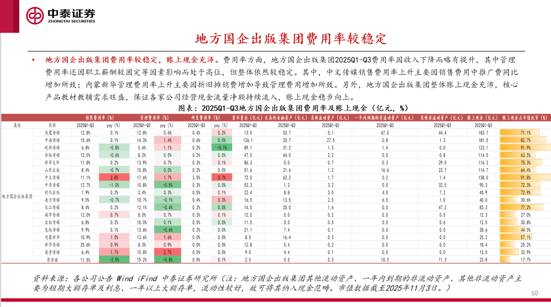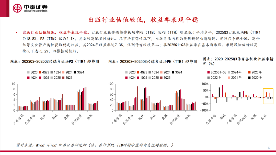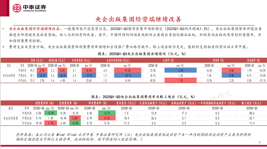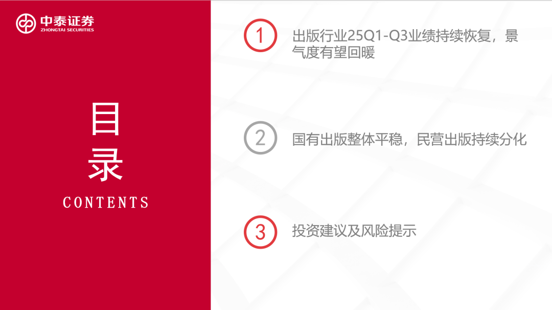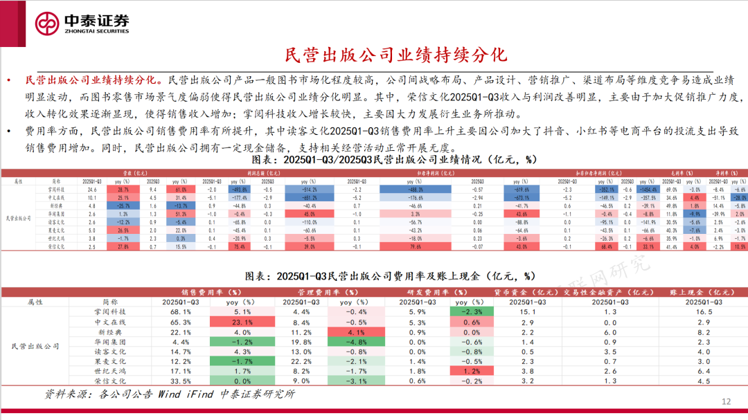 出版观点总结: 2025Q1-Q3出版行业营收960.8亿元,同比减少6.8%;归母净利润106.0亿元,同比增长13.3%。2025Q3营收307.3亿元,同比减少3.8%;归母净利润24.0亿元,同比增长9.4%。营收在教辅征订监管趋严、一般图书消费复苏偏弱情况下有所承压,但下降幅度有所收窄。同时,伴随税收优惠政策落地,行业利润端呈恢复趋势,连续三季度实现同比正向增长。其中,央企出版集团经营端继续改善;地方国企出版集团经营整体波动可控;民营出版公司业绩持续分化。我们认为,伴随后续教辅征订逐渐进入常态化监管阶段,出版市场景气度有望在强化新品研发以及渠道转型推动下,逐步回暖。 出版赛道攻守兼备。防守维度,出版红利标签不变,国有出版教材教辅业务短期虽受政策趋严影响略有波动,但我们看好其在中长期凭借国有背书、内容、渠道优势巩固强化基本盘。出版具备安全边际,地方国有出版行业平均分红比例50-60%具有可观的提升空间和能力。进攻维度,我们持续看好出版公司运用账上现金优势,加大对外并购以及资本运作力度,提高资金使用效率。同时,出版公司在手教育资源优势明显,有望利用充沛资金、丰富内容、强大渠道控制力优势,突破智慧教育(教育数字化、AI+教育等)产品、研学业务、课后服务、老年业务落地,挖掘线下门店空间价值,为业绩增长提供新增量。目前板块内头部公司2025年PE处于12-15倍,安全边际明显,建议关注垂类内容位居前列,红利优势明显,边际改善明显的国有出版公司:山东出版、中原传媒、长江传媒、中南传媒、南方传媒、凤凰传媒、新华文轩、浙版传媒、皖新传媒、时代出版、中文传媒、内蒙新华。 AI+教育布局领先的相关标的:南方传媒、世纪天鸿、中原传媒、皖新传媒。