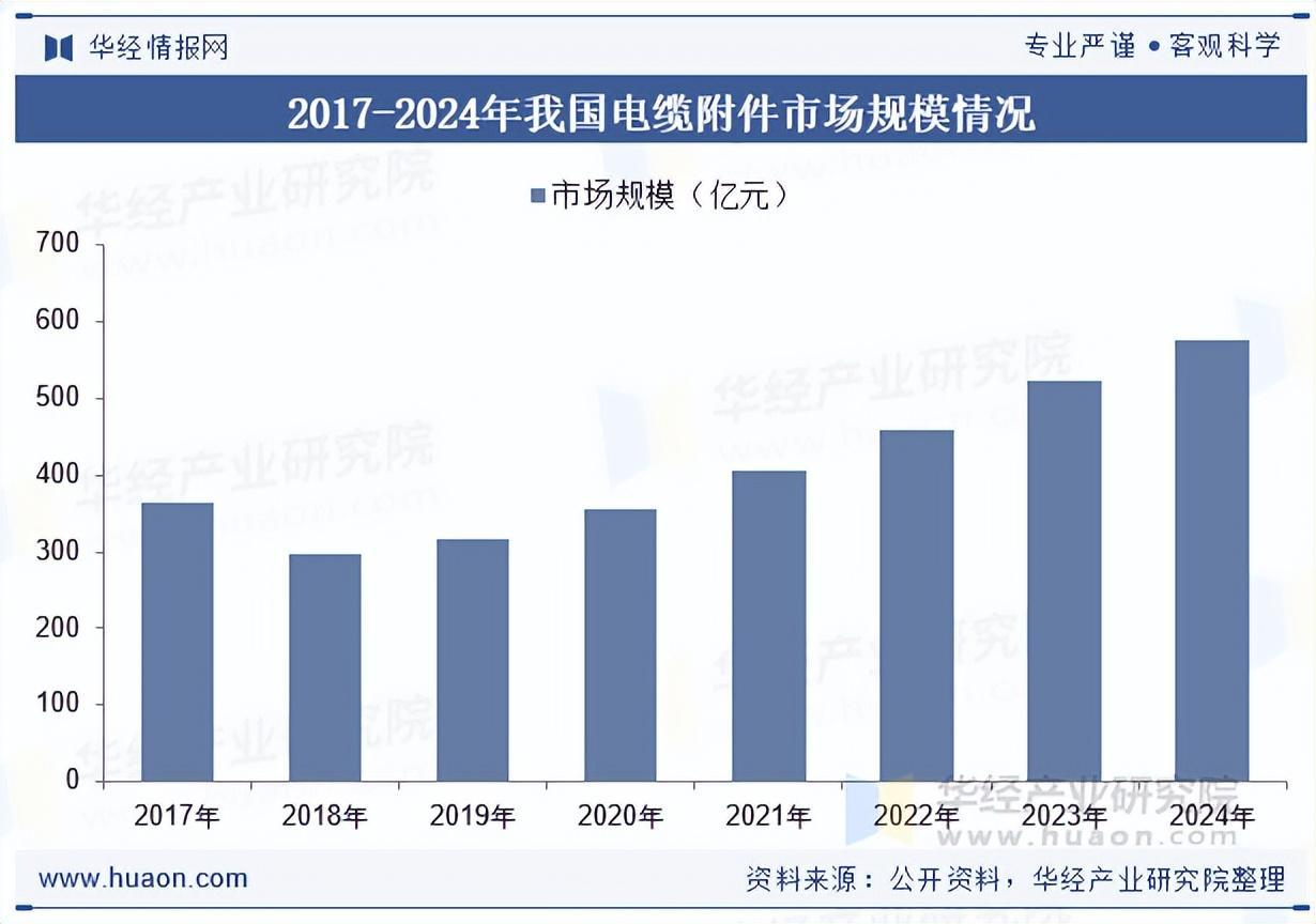 我国持续较高规模的电网建设投资将为电缆附件行业提供稳定的下游市场需求。城市配电网及农网升级改造工程、特高压输变电工程、高速电气化铁路、城市轨道交通等一系列重大基础设施建设工程相继投入建设,新能源发电、新能源汽车等新型产业快速崛起,则为我国电缆附件行业的高速发展提供了巨大的市场空间,据统计2024年我国电缆附件市场规模达到了576.6亿元,2017-2024年CAGR约为6.73%。