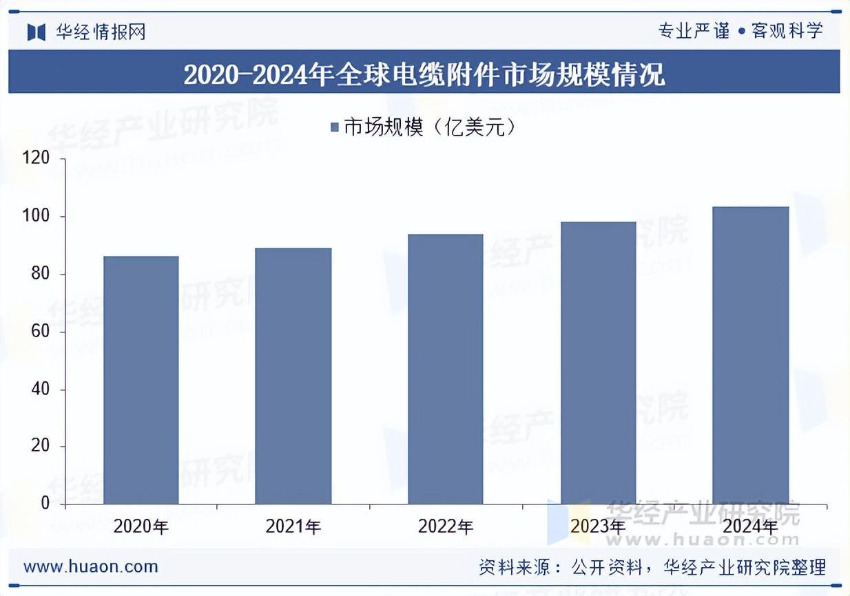 近年来,全球输配电设备行业一直在持续不断的发展,产业的规模也在不断的扩大,推动着全球电缆附件规模持续增长,据统计2020年至2024年,全球电缆附件市场规模有望增长103.7亿美元,整体市场年复合增长率约为4.73%。