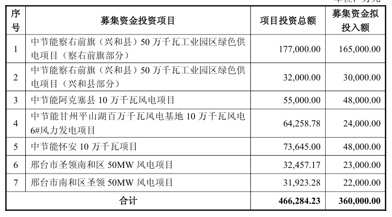 《预案》披露,节能风电拟向不超过35名特定投资者发行股票募集资金不超过36.00亿元,扣除发行费用后的募集资金净额拟用于投资7个风电项目,具体如下:
