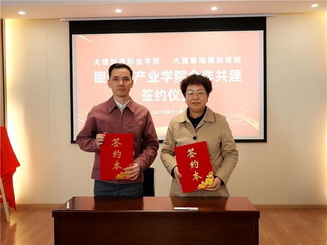 11月7日,大理护理职业学院与大理普瑞眼科医院举行“眼健康产业学院”合作共建签约暨揭牌仪式。大理护理职业学院党委书记廖惠群,党委委员、副院长郭向周,党委委员、副院长李洁,大理普瑞眼科医院业务院长黄世祥,执行院长尹智坚共同出席仪式,通过领导致辞、合作签约、学院揭牌等环节,正式开启校企协同培养眼健康专业人才、服务大理地区医疗事业的创新实践。