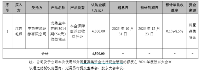 公司于2025年10月24日召开董事会,审议通过了《关于使用部分自有资金进行现金管理的议案》,同意公司使用不超过人民币12亿元(含本数)自有资金进行现金管理,用于购买安全性高、流动性好的产品(产品包括但不限于银行理财产品、结构性存款、定期存款、大额存单等,货币币种包括但不限于人民币、欧元、美元),使用期限自前次现金管理的授权到期之日起12个月内有效,即2025年11月13日至2026年11月12日。在上述额度及有效期内,资金可循环滚动使用。